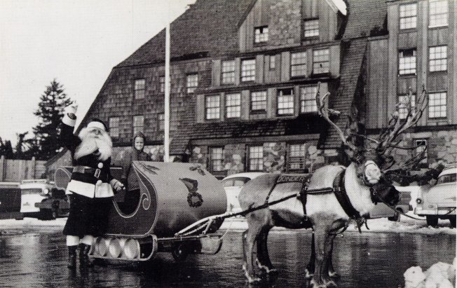 Santa’s appearance at Timberline Lodge is shown in this 1953 photo. Built in 1937 at the 6,000 ft. level, Timberline Lodge was officially opened on September 28, 1937, by the President, Franklin Roosevelt. The WPA (Works Progress Administration) built Timberline Lodge and interior furnishings were crafted by the Civilian Conservation Corps (CCC). Annual snowfall at Timberline averages 21 ft. |